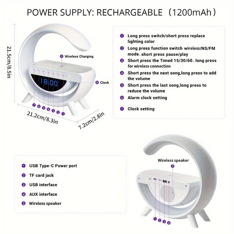 - Introducing our 4-in-1 Multifunctional Wireless Charging Atmosphere Light with a sleek G-shaped design. It's not just a lamp—it's also a Bluetooth speaker, music player, bedside light, and more. Perfect for work, study, reading, and sleep.